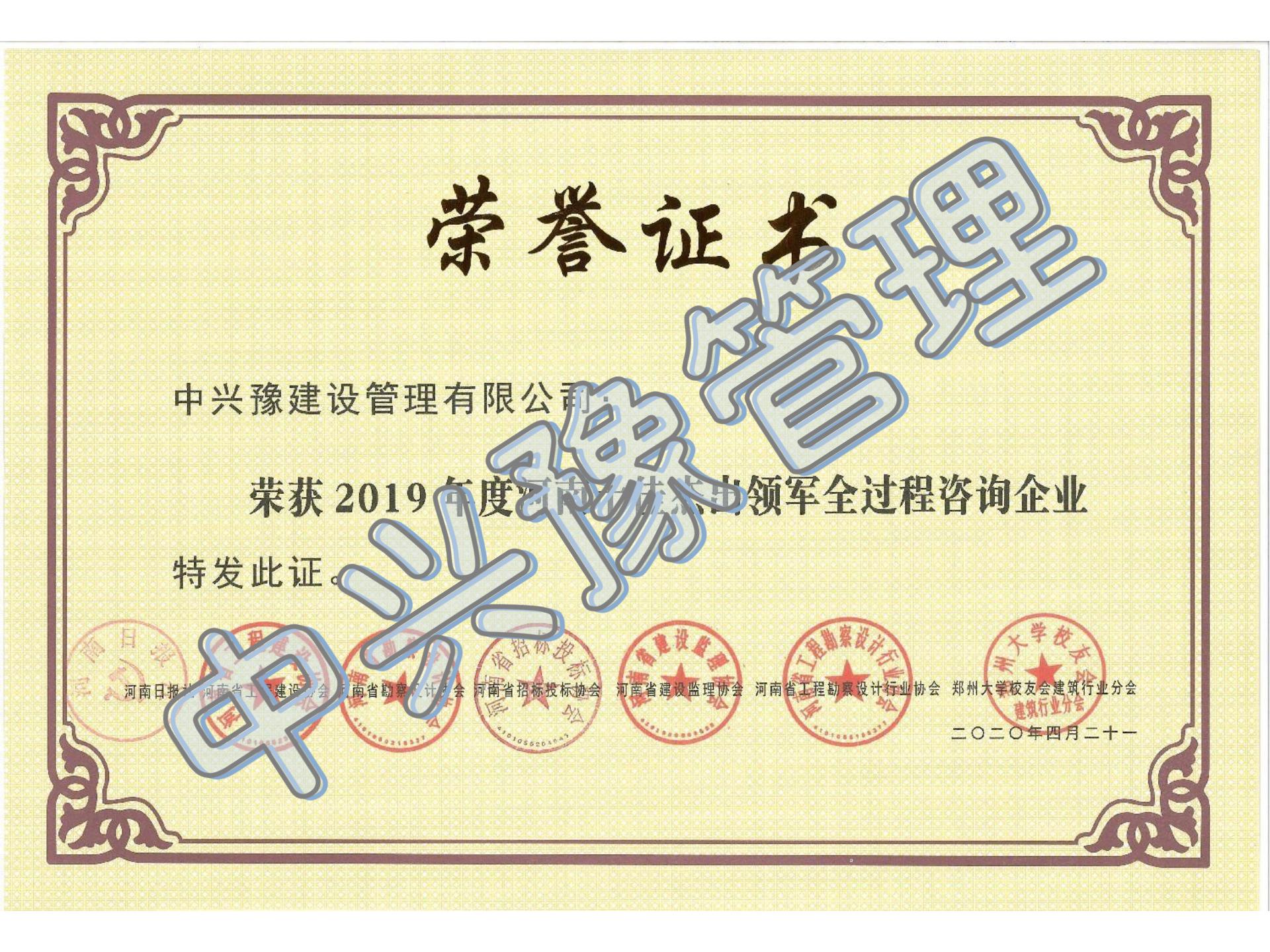 2019年度河南十佳杰出領軍全過程咨詢企業(yè)-公司榮譽