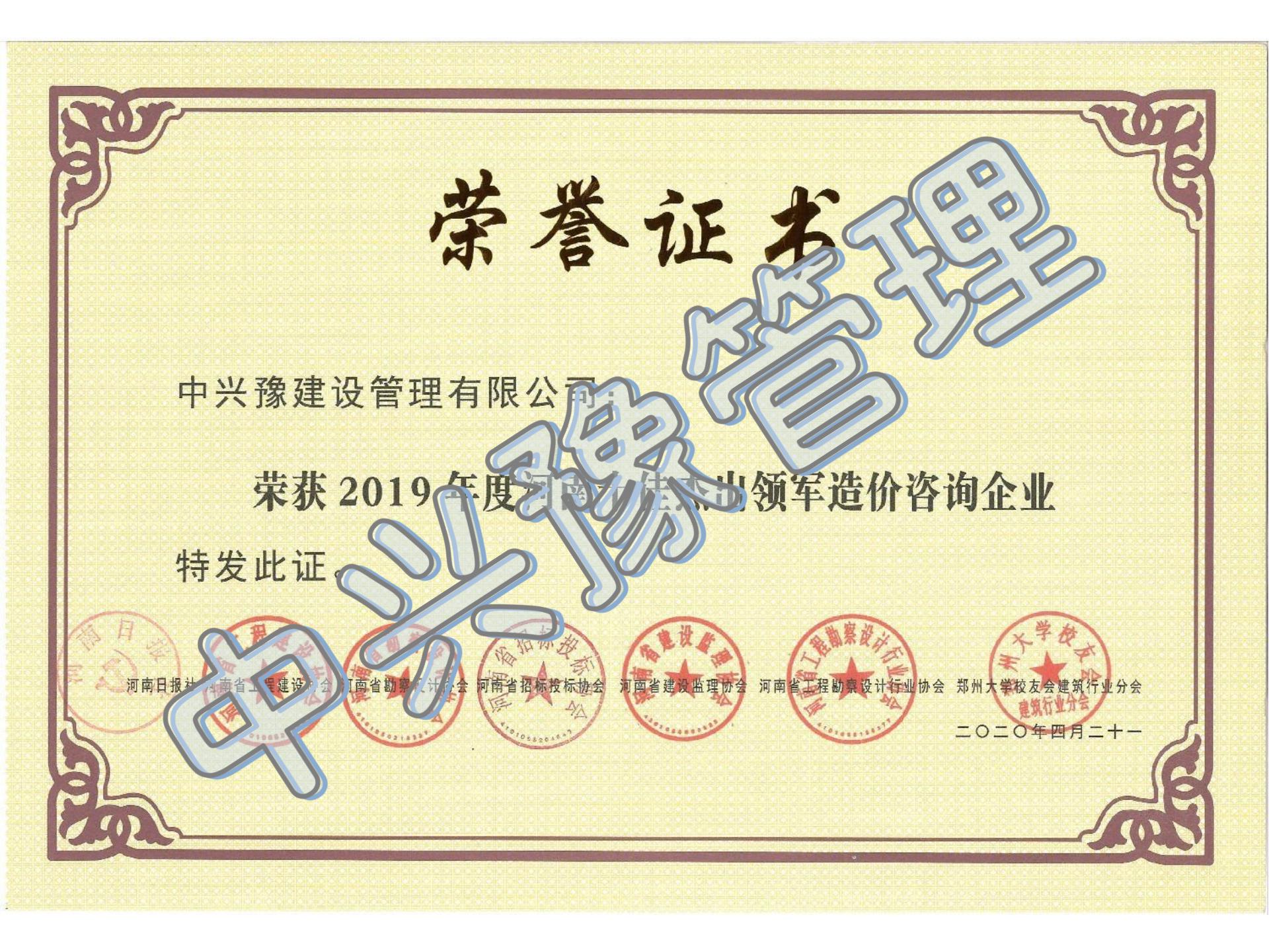 2019年度河南十佳杰出領(lǐng)軍造價(jià)咨詢企業(yè)-公司榮譽(yù)