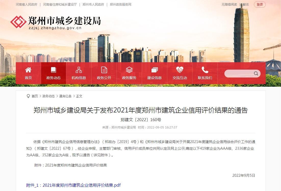 9月5日,鄭州市城鄉(xiāng)建設(shè)局公布了“鄭州市城鄉(xiāng)建設(shè)局關(guān)于發(fā)布2021年度鄭州市建筑企業(yè)信用評價結(jié)果的通告”。經(jīng)主管部門審核、信用評價成員單位共同認定,我公司榮獲鄭州市工程造價AAA級企業(yè)、鄭州市工程招標代理AAA級企業(yè)、鄭州市工程監(jiān)理AA級企業(yè)。