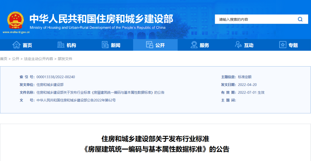 住房和城鄉(xiāng)建設(shè)部日前發(fā)布公告,批準(zhǔn)《房屋建筑統(tǒng)一編碼與基本屬性數(shù)據(jù)標(biāo)準(zhǔn)》(以下簡稱《標(biāo)準(zhǔn)》)為行業(yè)標(biāo)準(zhǔn),編號為JGJ/T496-2022,自2022年7月1日起實施。行業(yè)標(biāo)準(zhǔn)《房屋代碼編碼標(biāo)準(zhǔn)》(JGJ/T246-2012)同時廢止。