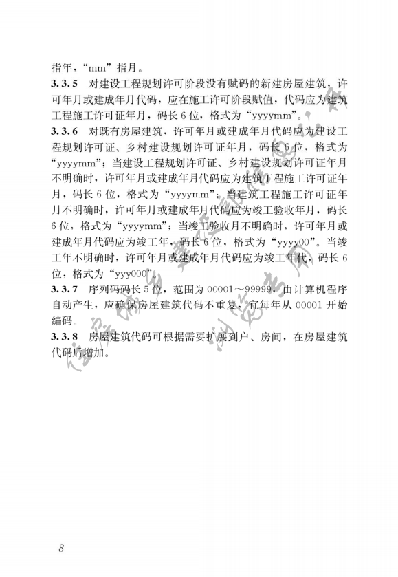 《標(biāo)準(zhǔn)》明確,房屋建筑代碼應(yīng)作為房屋建筑的統(tǒng)一身份標(biāo)識,用于房屋建筑的信息歸集、關(guān)聯(lián)和共享;應(yīng)在時間和空間上具有惟一性,并應(yīng)貫穿于房屋建筑的設(shè)計、采購、施工、交易、運行維護和拆除等生命周期。房屋建筑代碼應(yīng)在工程建設(shè)項目辦理建設(shè)工程規(guī)劃許可證、鄉(xiāng)村建設(shè)規(guī)劃許可證時編碼;當(dāng)前在建項目未編碼的,應(yīng)在辦理建筑工程施工許可證、竣工驗收備案時編碼。既有房屋的房屋建筑代碼可在房屋建筑調(diào)查或其他需要時進行編碼。編碼對象應(yīng)為有固定結(jié)構(gòu)的房屋建筑,小型房屋建筑不宜編碼。房屋建筑在改建、擴建時,當(dāng)建筑結(jié)構(gòu)類型發(fā)生改變時,或當(dāng)建筑高度、基底面積、總建筑面積中任何一項改變超過±50%時,該房屋建筑應(yīng)重新編碼。新的代碼應(yīng)與舊碼建立關(guān)聯(lián)關(guān)系,以便信息的傳遞。當(dāng)行政區(qū)劃代碼發(fā)生變更時,已完成編碼的房屋建筑不再重新編碼,未進行編碼的應(yīng)使用變更后的行政區(qū)劃代碼進行編碼。