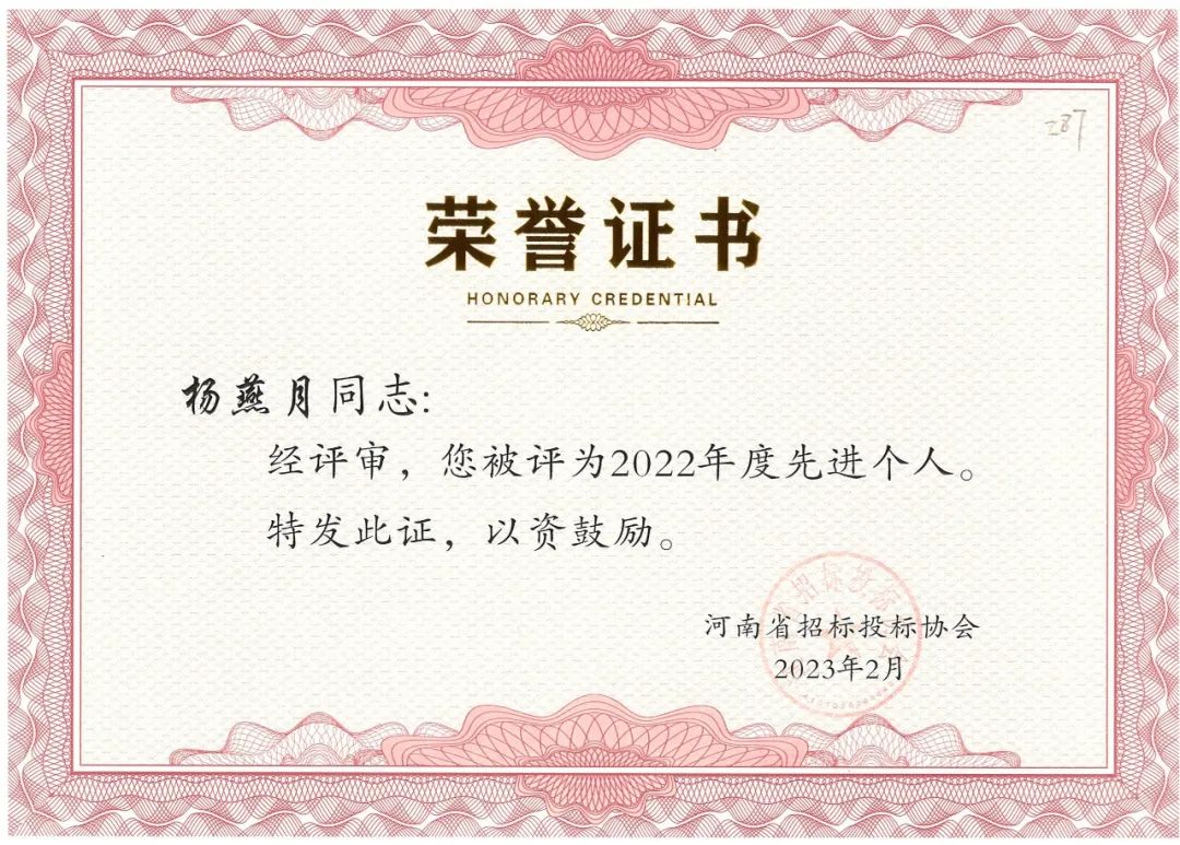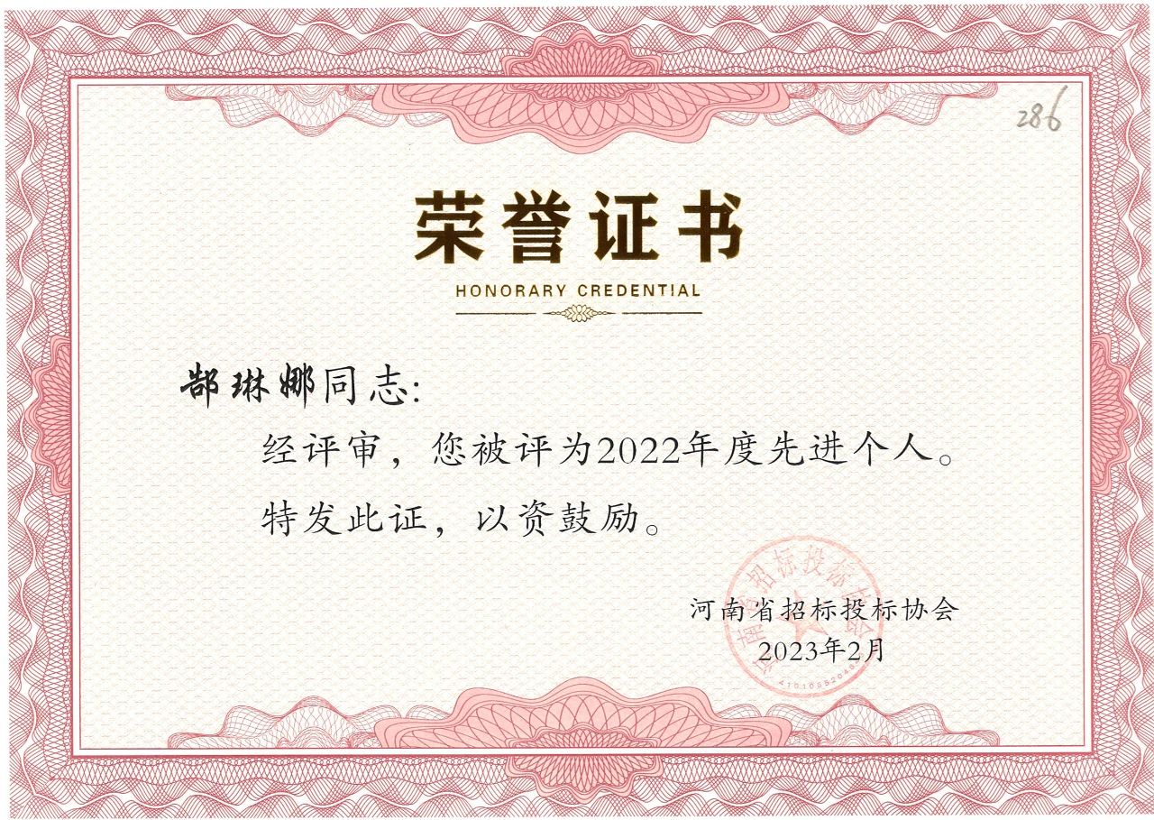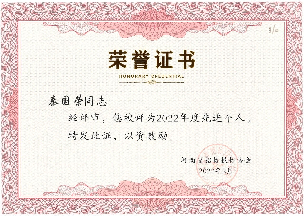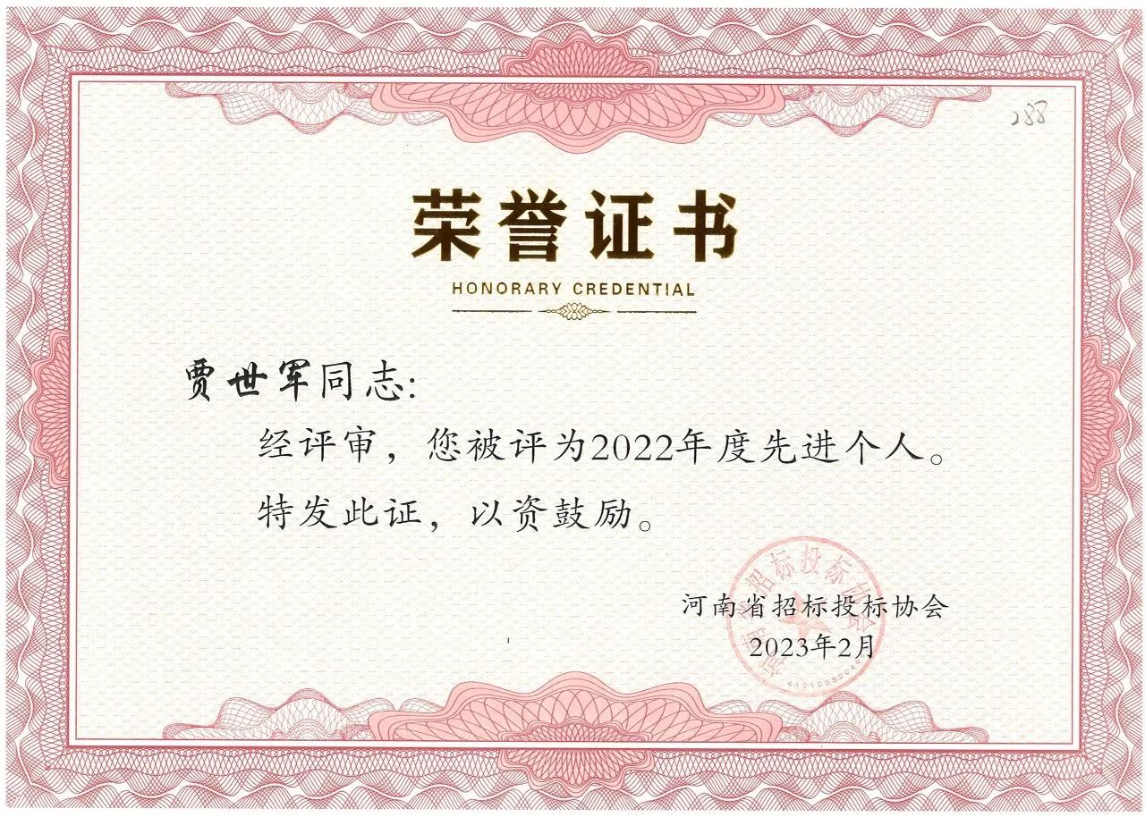 近日,河南省招標(biāo)投標(biāo)協(xié)會公布了“河南省招標(biāo)投標(biāo)協(xié)會關(guān)于表彰2022年度先進(jìn)會員單位、先進(jìn)個人的決定”。我公司榮獲2022年度先進(jìn)會員單位榮譽(yù)稱號,八位同志獲得先進(jìn)個人的榮譽(yù)。