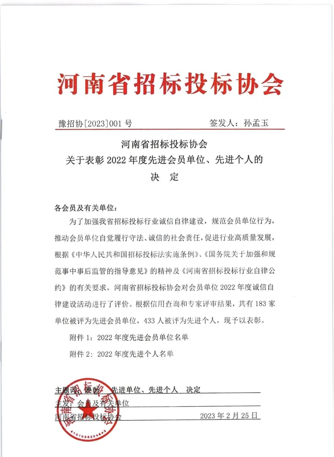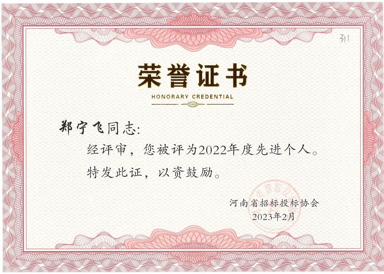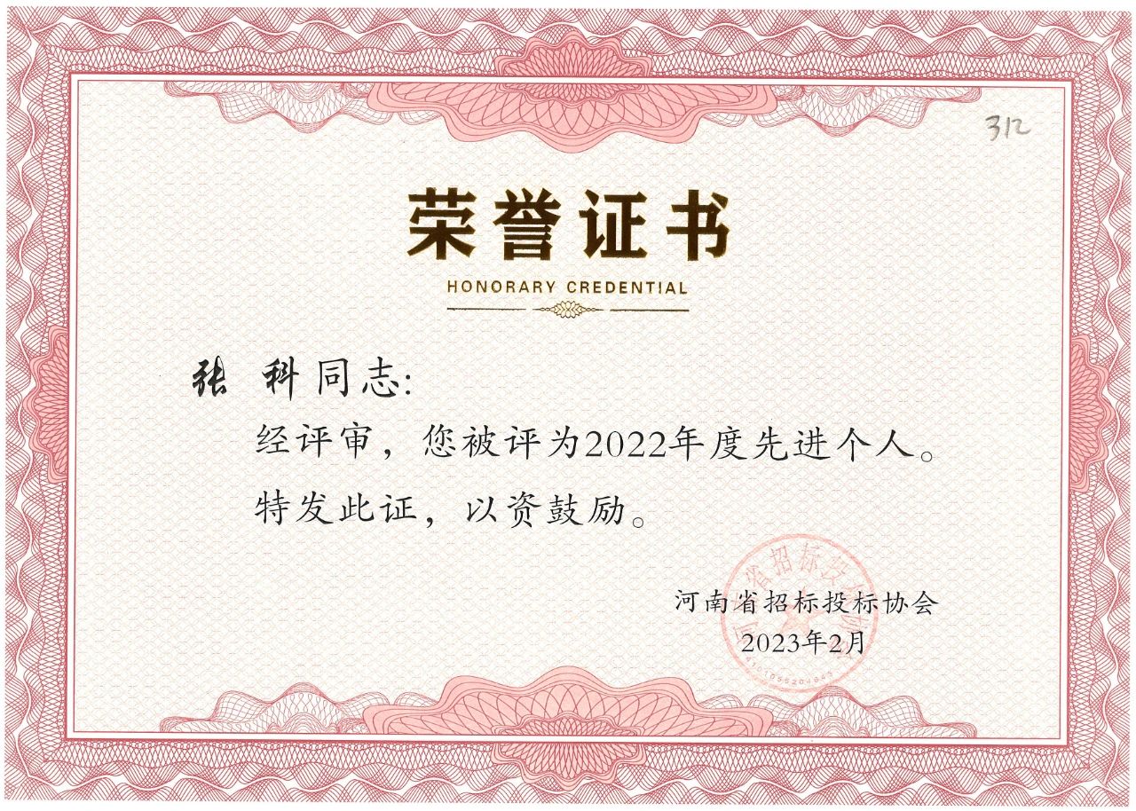 近日,河南省招標(biāo)投標(biāo)協(xié)會公布了“河南省招標(biāo)投標(biāo)協(xié)會關(guān)于表彰2022年度先進(jìn)會員單位、先進(jìn)個人的決定”。我公司榮獲2022年度先進(jìn)會員單位榮譽(yù)稱號,八位同志獲得先進(jìn)個人的榮譽(yù)。