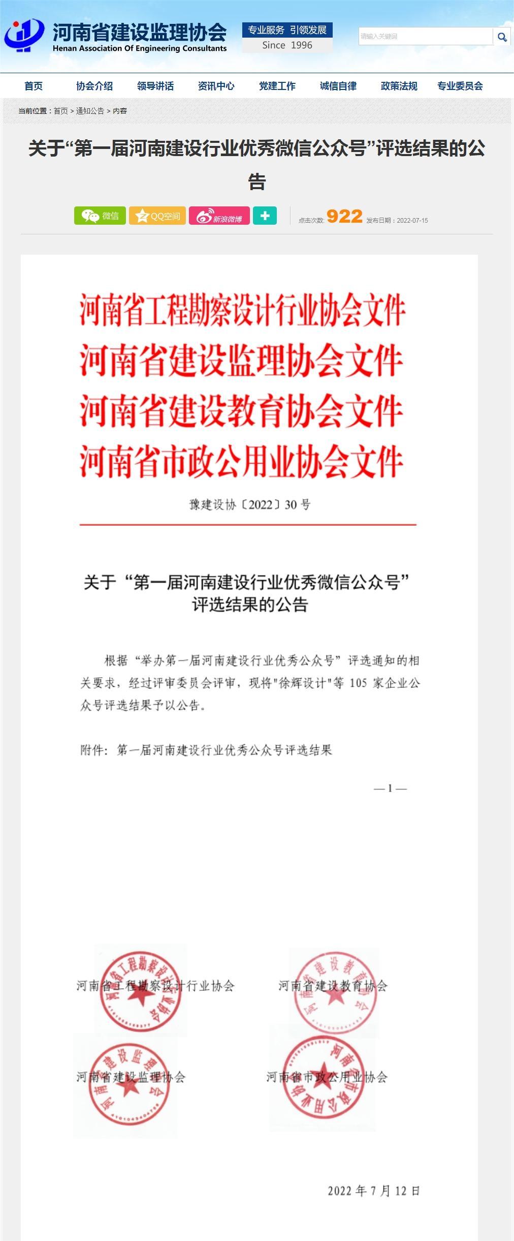 近日,由河南省工程勘察設(shè)計(jì)行業(yè)協(xié)會(huì)、河南省建設(shè)監(jiān)理協(xié)會(huì)、河南省建設(shè)教育協(xié)會(huì)、河南省市政公用業(yè)協(xié)會(huì)聯(lián)合舉辦的“第一屆河南建設(shè)行業(yè)優(yōu)秀微信公眾號(hào)”評(píng)選工作落下帷幕,經(jīng)評(píng)審委員會(huì)評(píng)審,中興豫建設(shè)管理有限公司榮獲一等獎(jiǎng)。