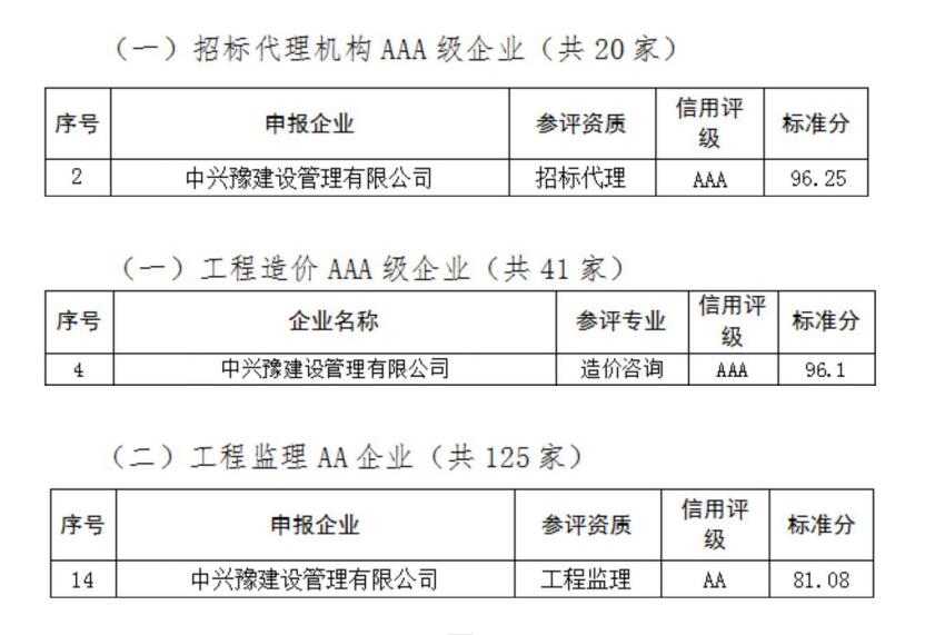 9月27日,鄭州市城鄉(xiāng)建設局發(fā)布了《關于2022年度鄭州市建筑企業(yè)信用評價結果的通告》,經(jīng)企業(yè)申報、主管部門審核、信用評價成員單位共同認定及網(wǎng)上公示,中興豫建設管理有限公司被評為“招標代理機構AAA級企業(yè)”、“工程造價AAA級企業(yè)”、“工程監(jiān)理AA級企業(yè)”。
