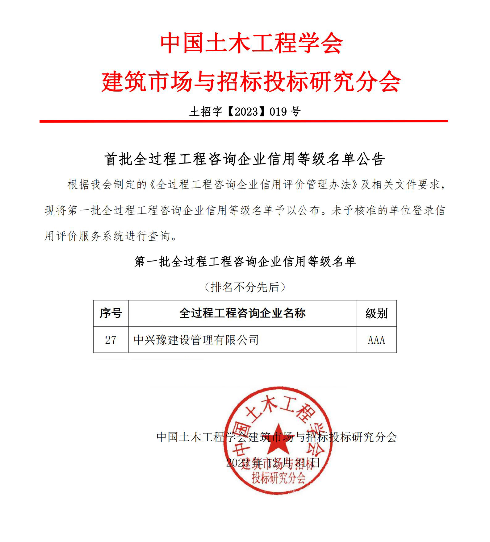 喜訊 | 中興豫建設(shè)管理有限公司榮獲國家首批“全過程工程咨詢企業(yè)信用等級評價AAA企業(yè)”
