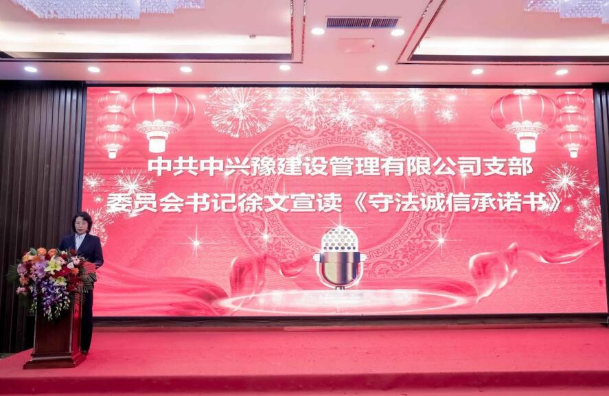 中共中興豫建設(shè)管理有限公司支部委員會書記徐文宣讀《守法誠信承諾書》,公司總裁、副總裁及各中心總經(jīng)理分別簽訂《守法誠信承諾書》。