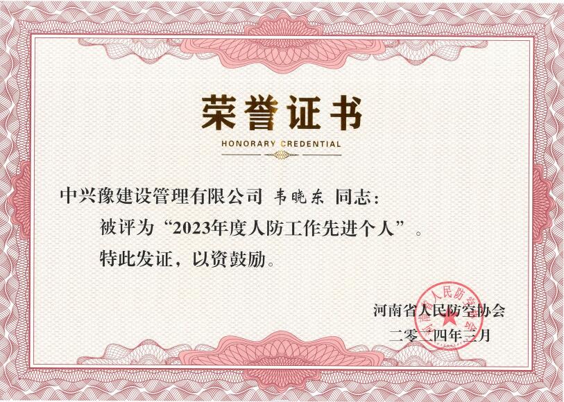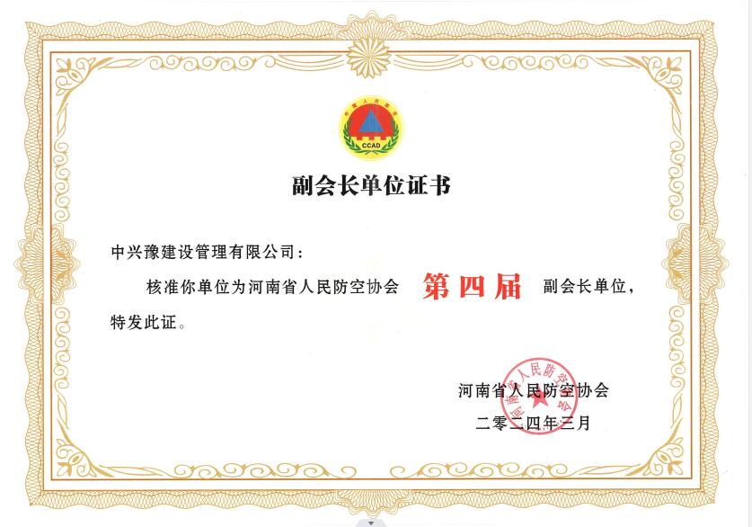 近日,河南省人民防空協(xié)會(huì)頒發(fā)了關(guān)于優(yōu)秀會(huì)員單位及先進(jìn)工作者的榮譽(yù)證書(shū),我公司核準(zhǔn)為河南省人民防空協(xié)會(huì)第四屆副會(huì)長(zhǎng)單位、2023年度人防行業(yè)先進(jìn)單位,工程監(jiān)理中心總經(jīng)理韋曉東榮獲2023年度人防工作先進(jìn)個(gè)人榮譽(yù)稱號(hào)。