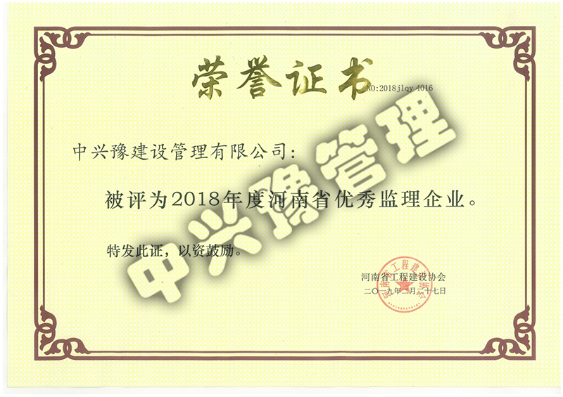 2018年度河南省工程建設優(yōu)秀監(jiān)理企業(yè)-公司榮譽