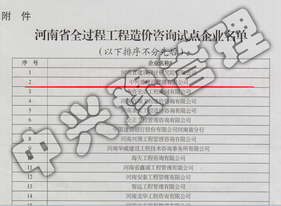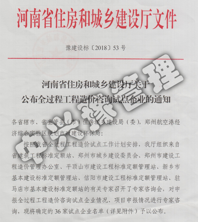 2018河南省住房和城鄉(xiāng)建設(shè)廳關(guān)于公布全過程工程造價咨詢試點(diǎn)企業(yè)文件-公司榮譽(yù)