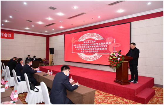 副總裁王明軍宣讀《關(guān)于對獲得2020年度工程質(zhì)量獎和榮譽獎的項目部表彰獎勵的決定》、《關(guān)于表彰2020年度先進集體和先進工作者的決定》,并號召全體同仁要以受到表彰的先進集體和先進工作者為榜樣,在學習先進中提升自我,在對標先進中持續(xù)奮斗,在爭當先進中擔當作為,為中興豫的美好明天貢獻力量!